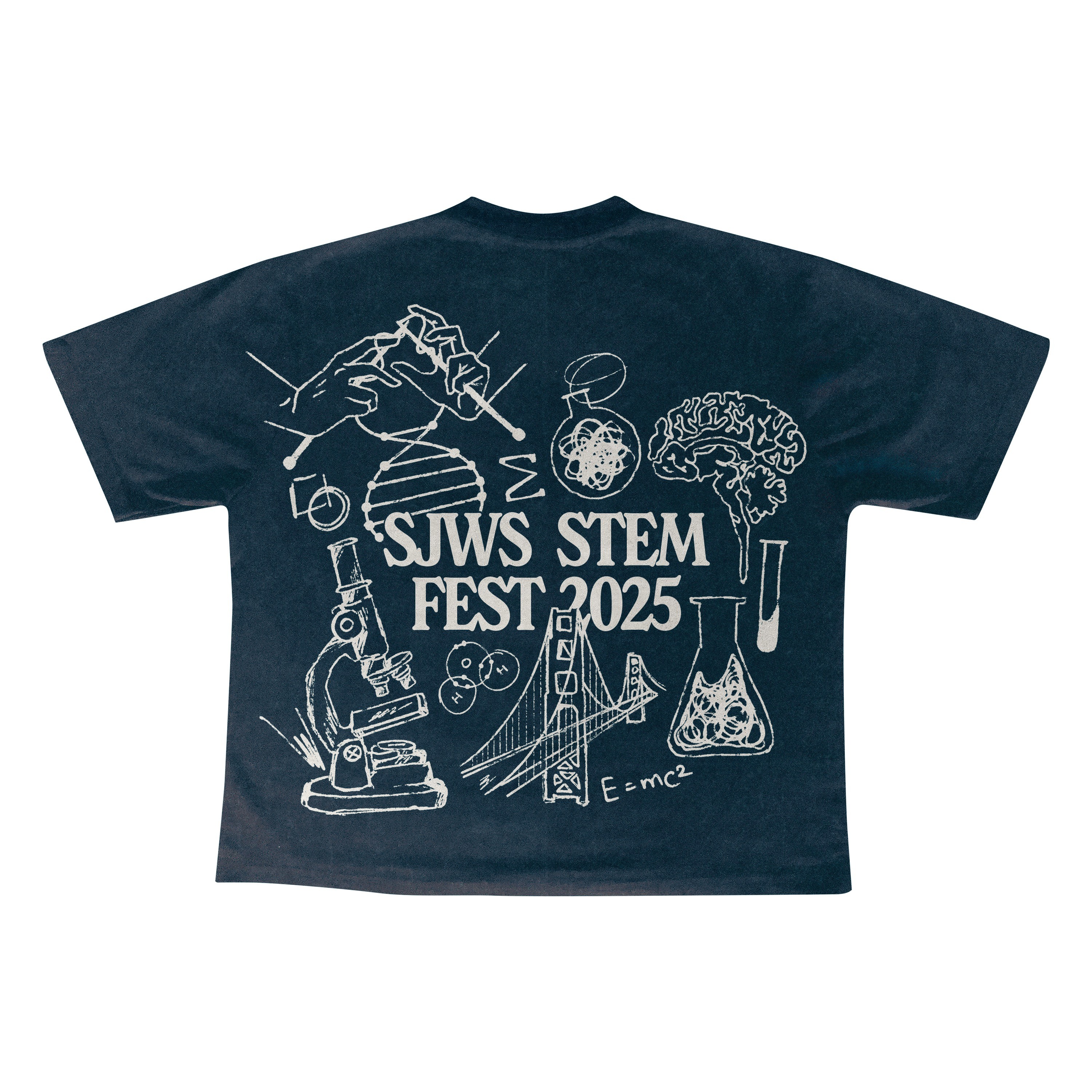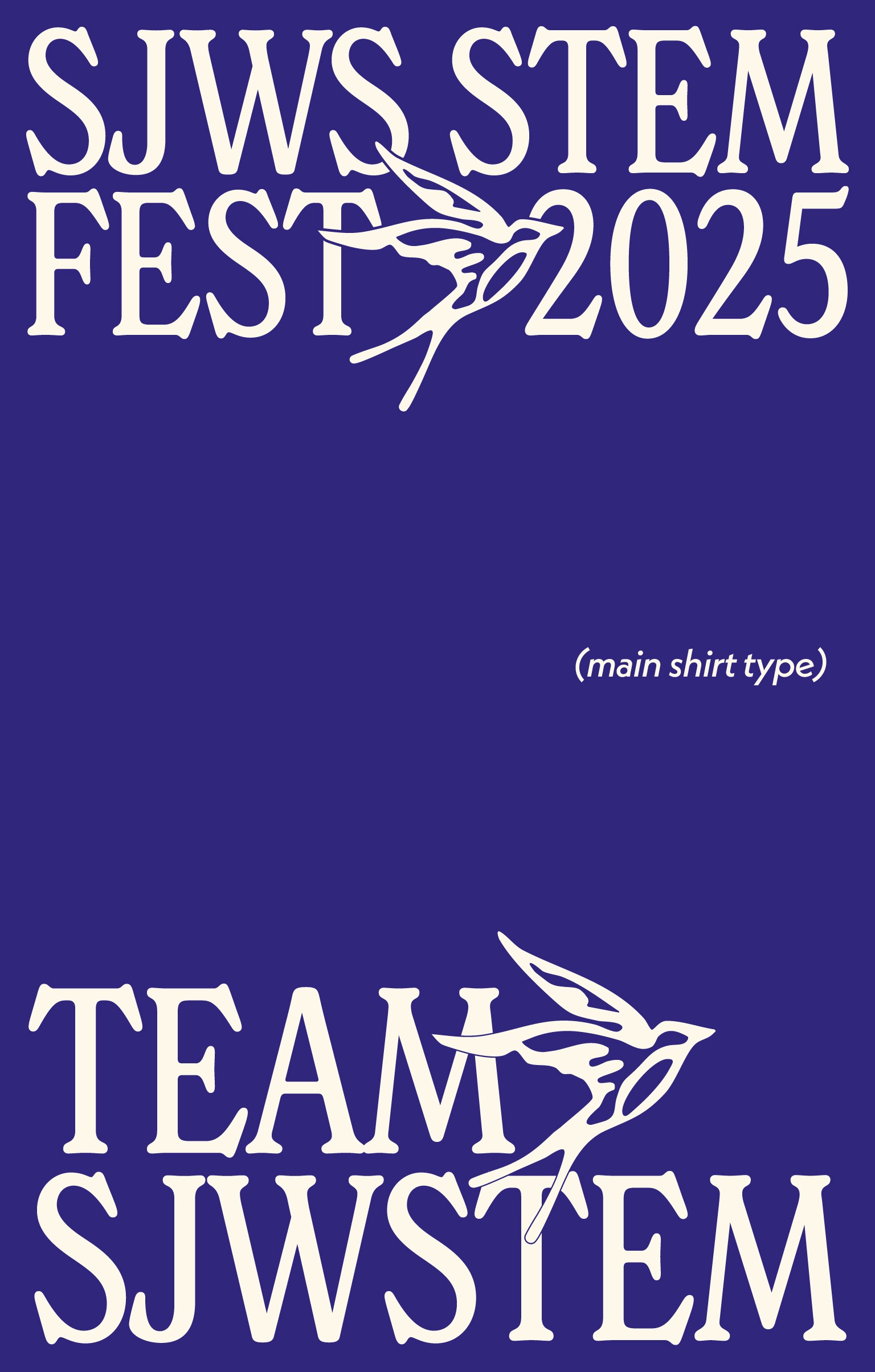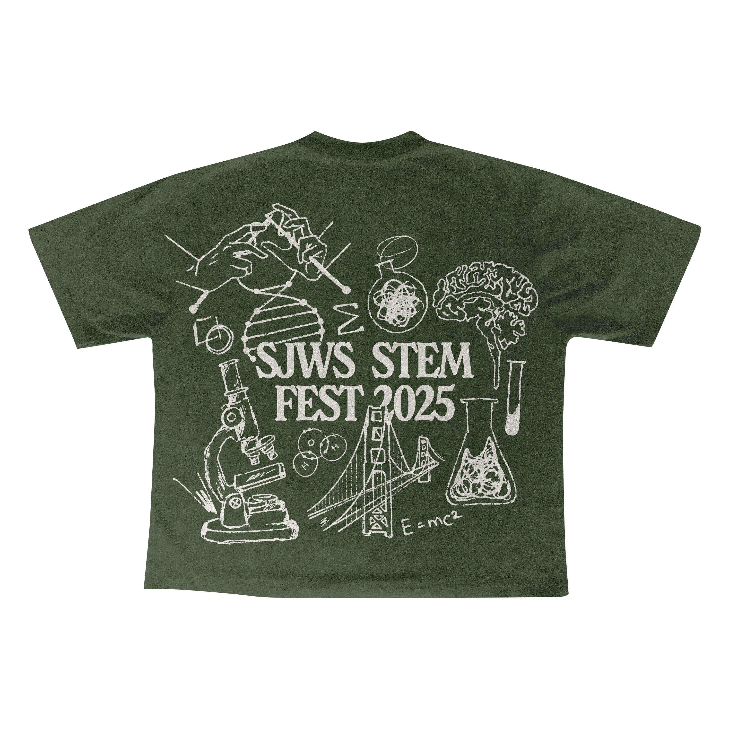 Branding and event graphics for a school STEM fest, including the main logo, volunteer shirts, olympiad posters, and event schedules.