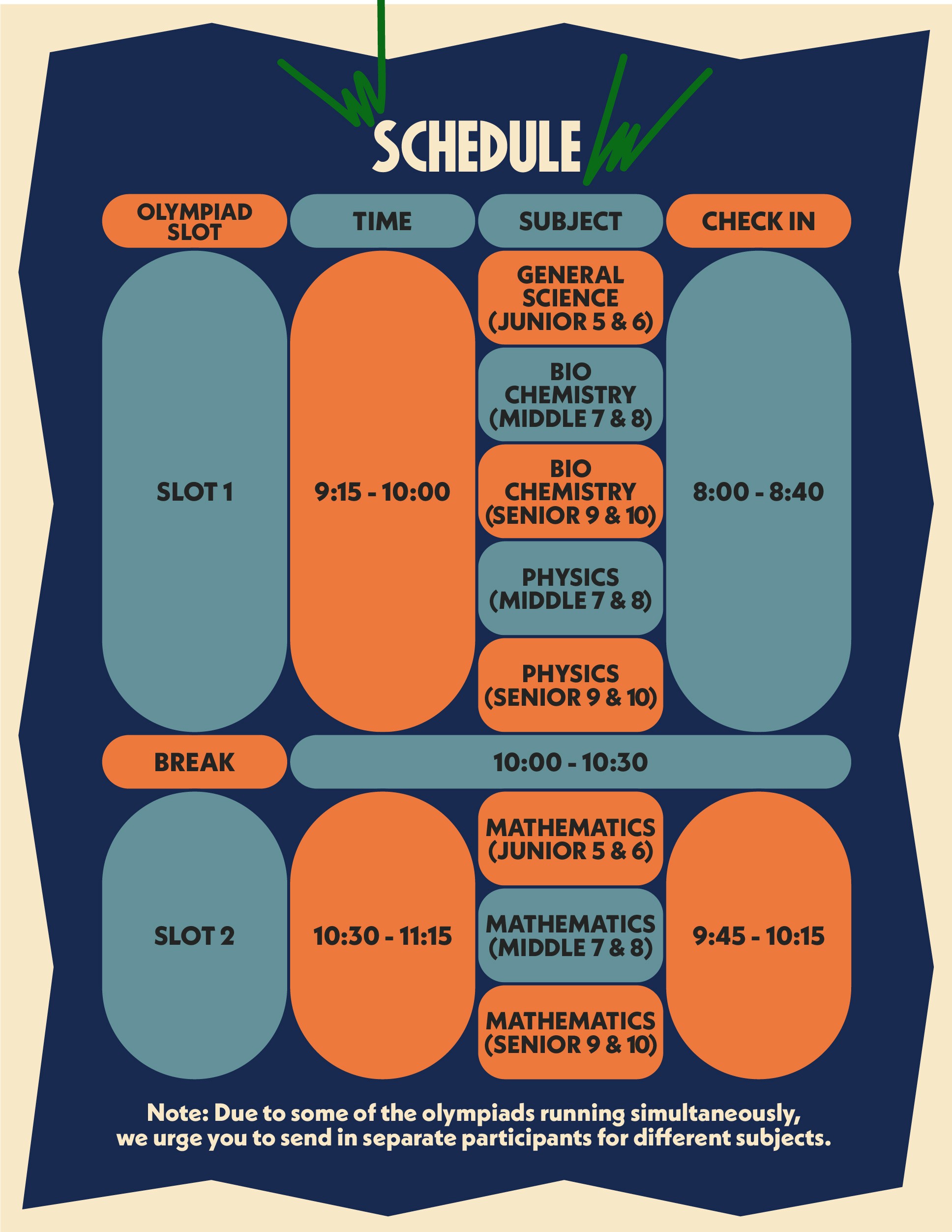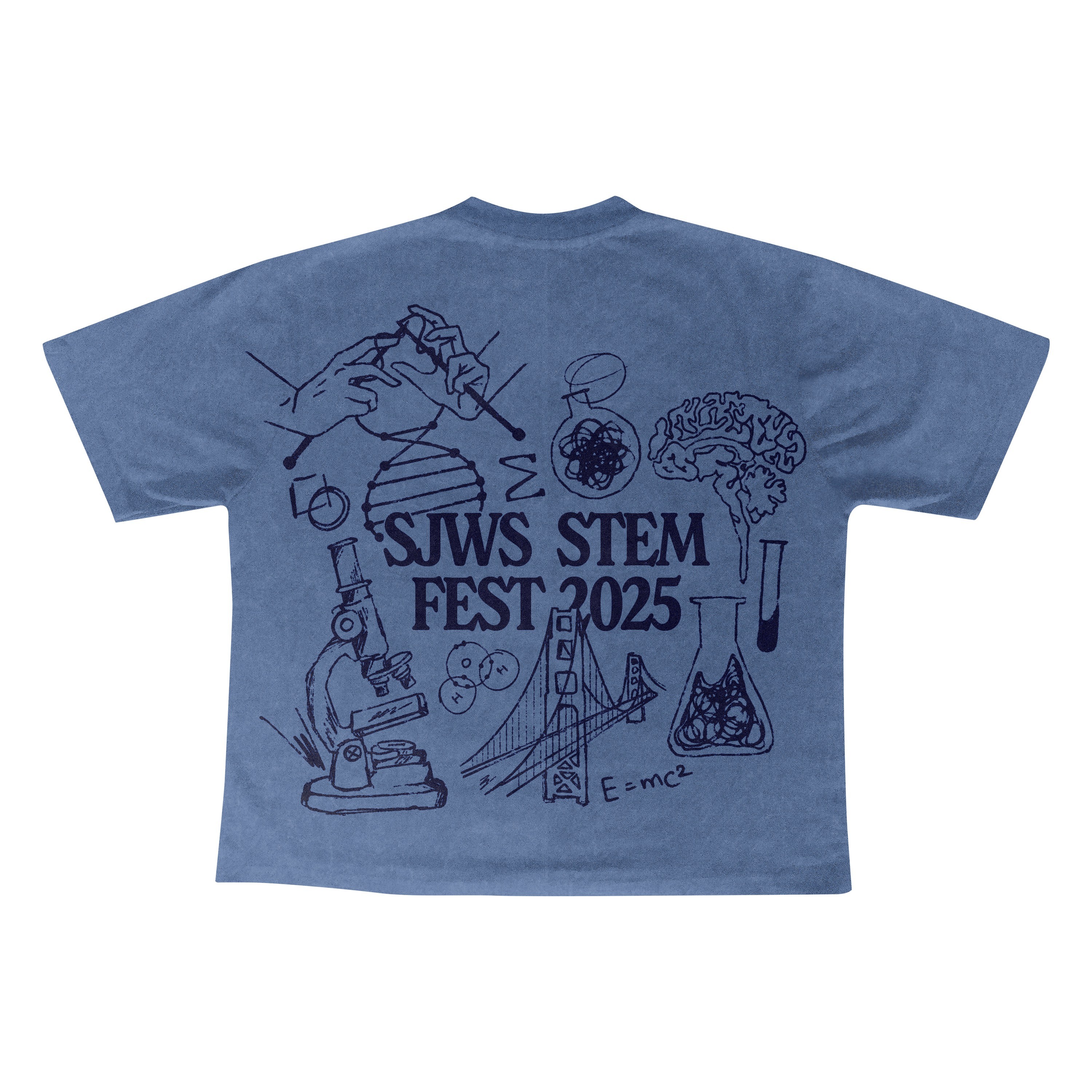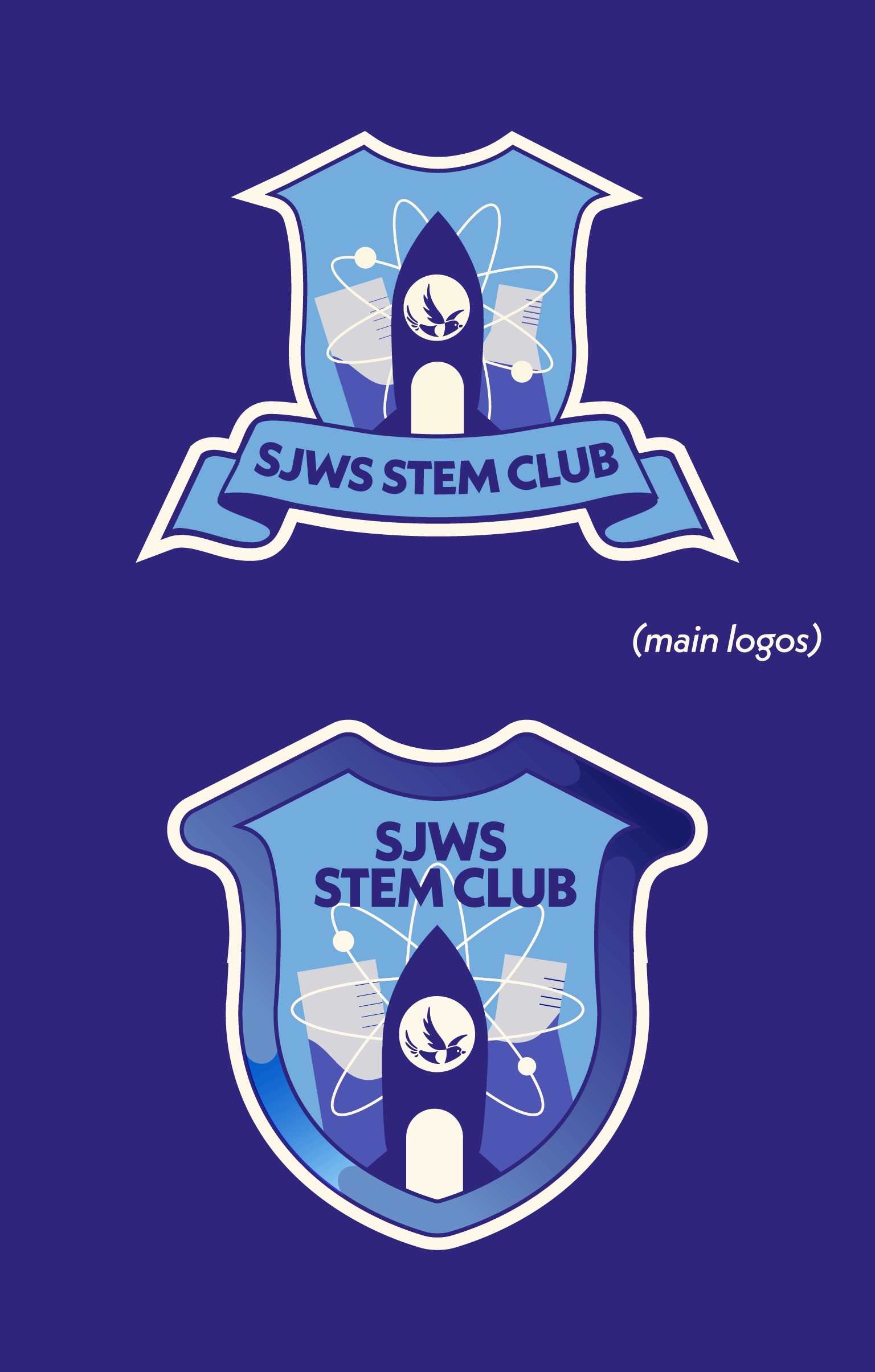 Branding and event graphics for a school STEM fest, including the main logo, volunteer shirts, olympiad posters, and event schedules.